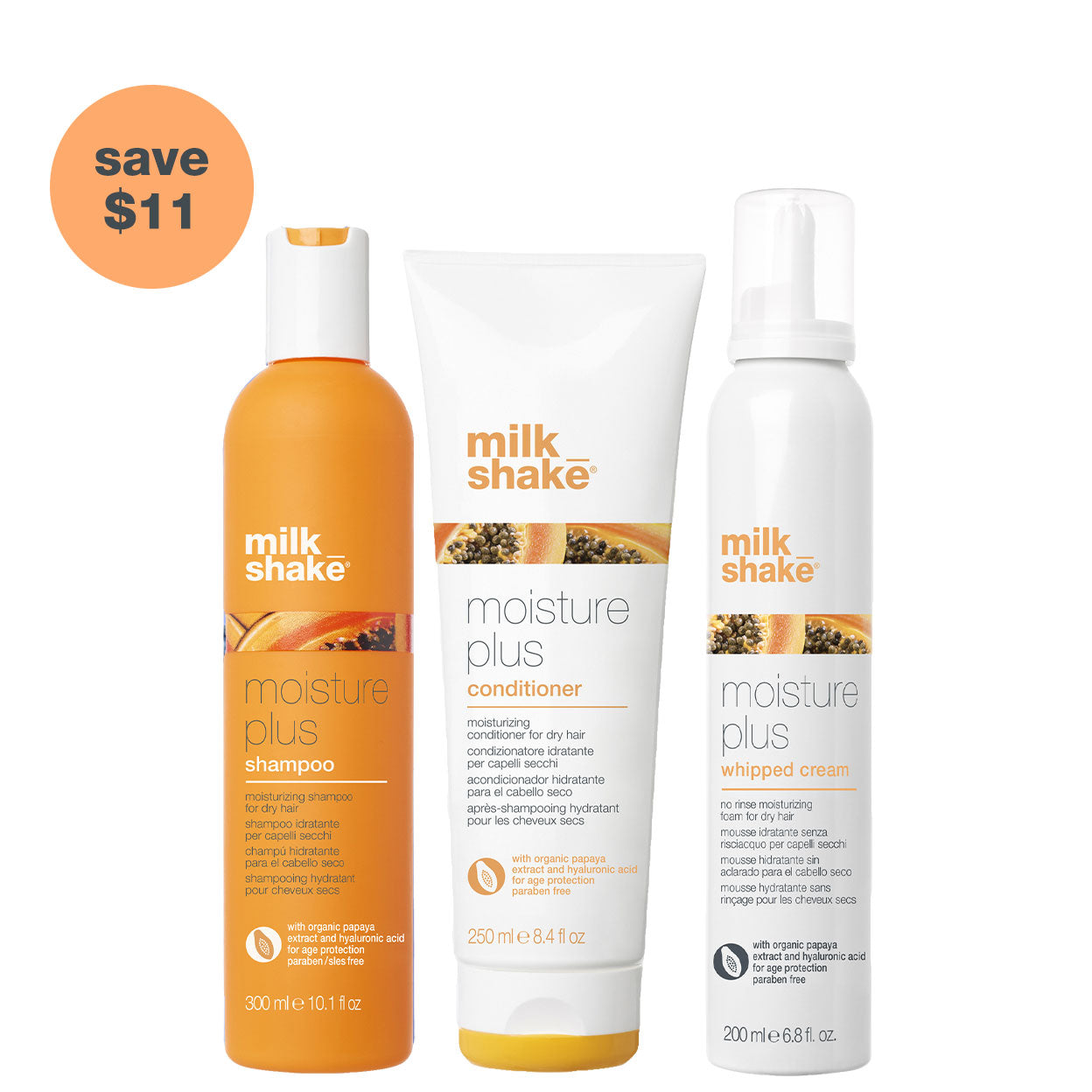 milk_shake dry hair value kit is a treatment that is formulated specifically for dry hair. It gives the sensation of healthy hair with brand new formulas and a delicious fragrance. milk_shake moisture plus shampoo, conditioner and whipped cream are all enriched with organic papaya extract and with a low molecular weight and leave hair lustrous, shiny, beautiful and radiant from the first application. The kit has two results on the hair: maximum hydration and visibly younger hair. PLEASE NOTE: Unfortunately, this product cannot be shipped to PO boxes due to aerosol restrictions.